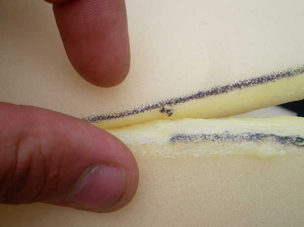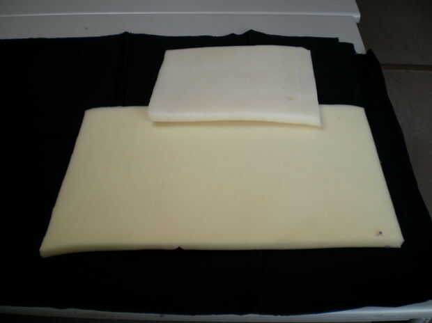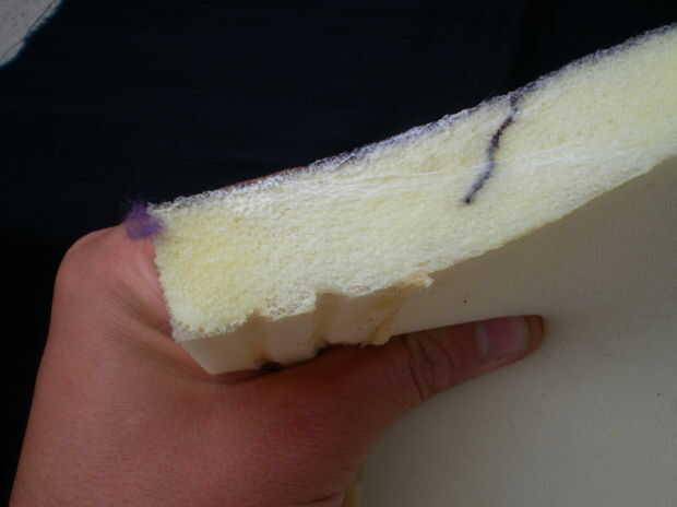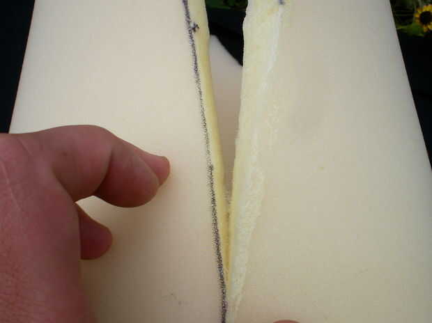 para pegar le deba aplicar el cemento de contacto en ambos lados de la esponja, esperar dos minutos y luego unen los bordes siempre uso cemento de contacto para la esponja porque funciona realmente bien y es elástico