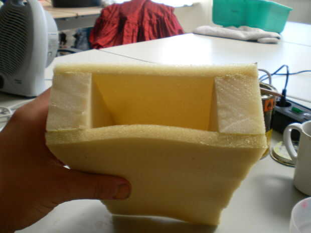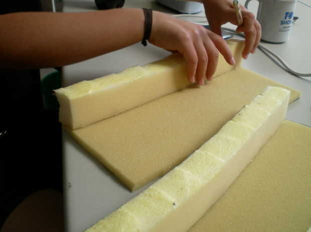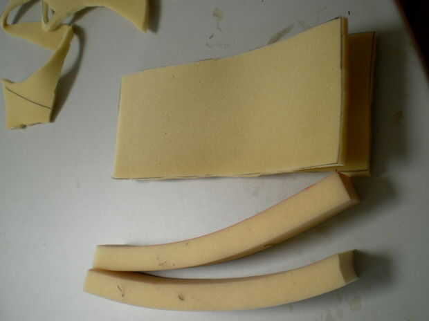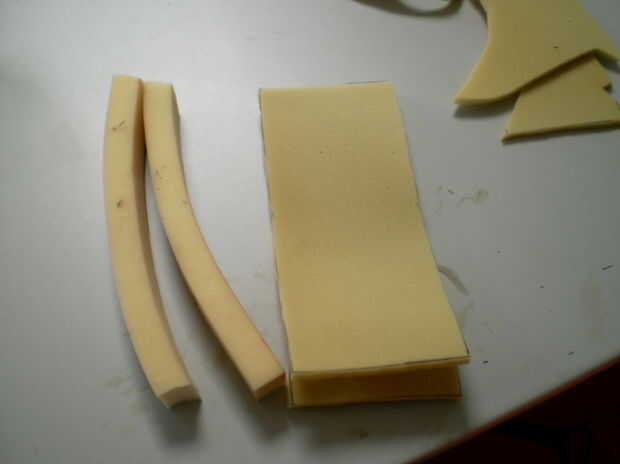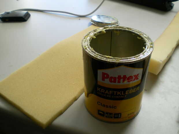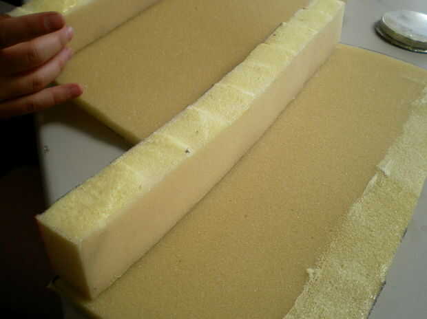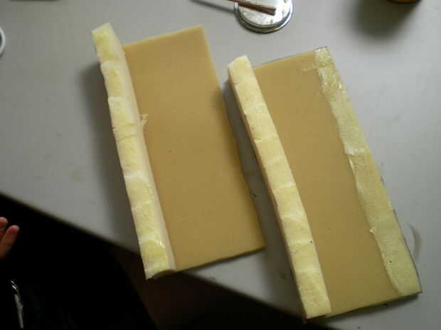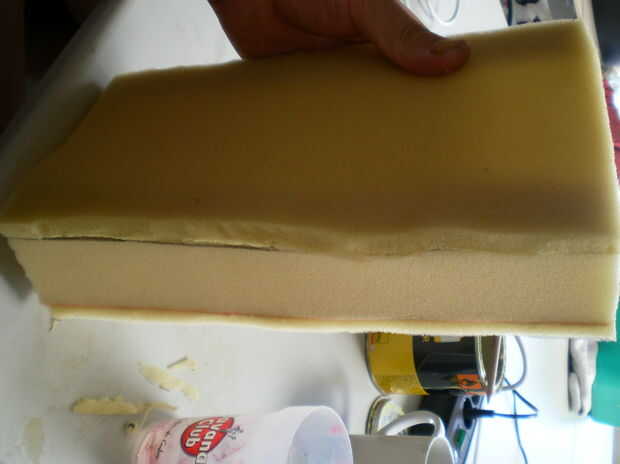 cortar dos trozos de una esponja gruesa y dos paneles de una fina pegamento para formar una forma de ladrillo con un agujero dentro de la Use cemento de contacto para pegar espuma se aplican a ambos lados .esperar por dos minutos y luego unen las partes
