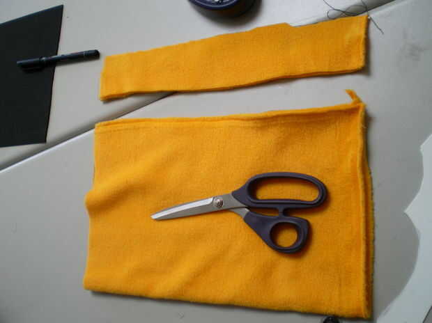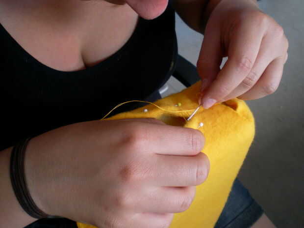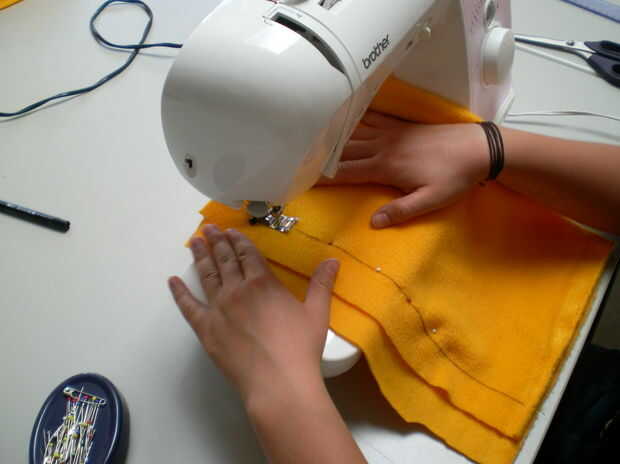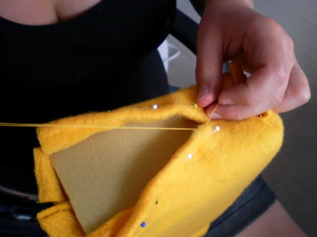 los lados del polar en la parte posterior de la marioneta utilizando una máquina de coser, la puntada cortar exceso Coloque en marioneta el paño grueso y suave que solo ha cosido. coser la parte superior primero y luego los bordes de la parte superior con una puntada escalera Esta es una puntada muy sencilla e invisible