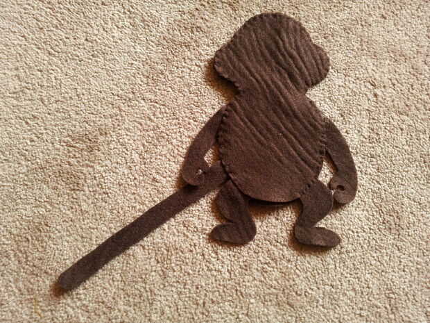 Ahora, ya que es una marioneta de mano, tendremos que dejar un espacio entre las piernas del mono de la mano de un niño a patinar en.
