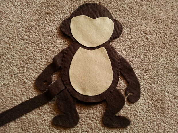 Utilizando la imagen del mono como guía (en el documento de plantilla), presione con cuidado cada pieza marrón claro en el cuerpo.