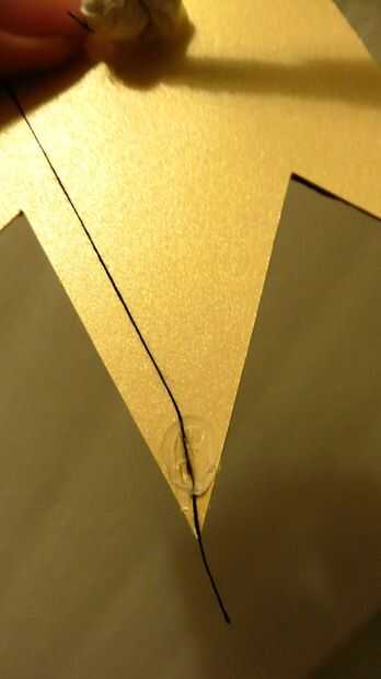 2. Tomar el trozo de hilo que sujeta el cuerpo, para ser 12" de largo y se ata en el extremo posterior de la manija (parte inferior de la Cruz).