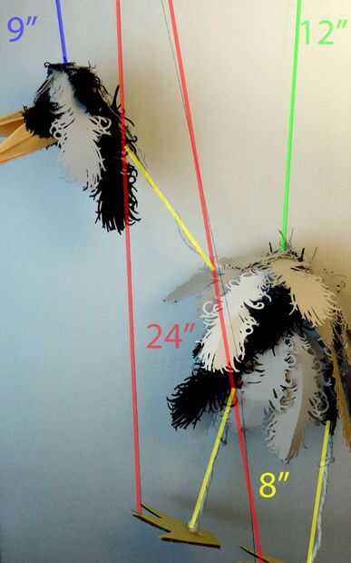 3. Cortar 24" hilo, pegamento un extremo a la punta del pie, atar el otro extremo del hilo a la manija de ese lado del pie. Hacer esto para ambos pies.