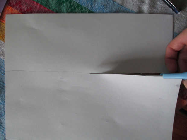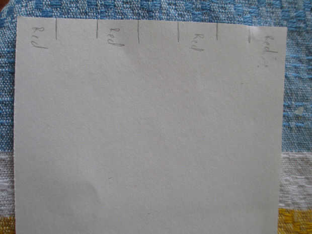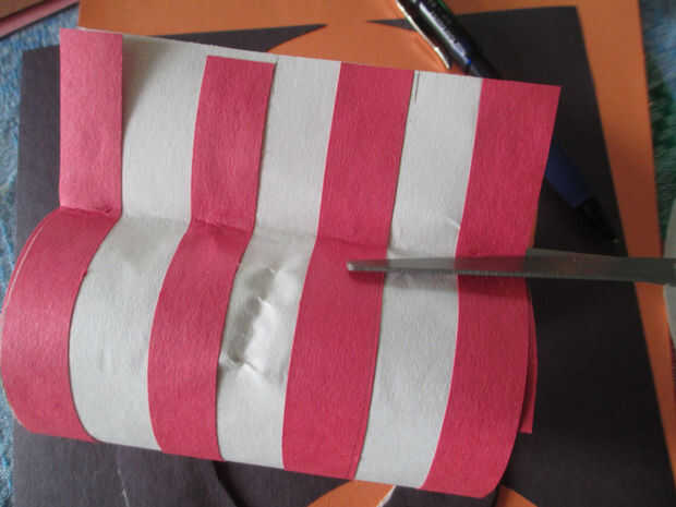 2. corte rojo cuatro tiras de papel que son aproximadamente 1/8 de la altura de la pieza blanca de papel