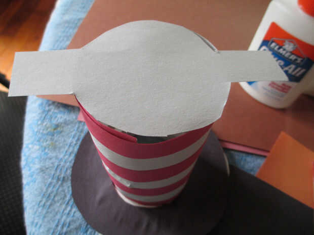 8. doble las lengüetas en y pegar en el interior pared del sombrero. Asegúrese de que el círculo quede al ras con la parte superior del sombrero