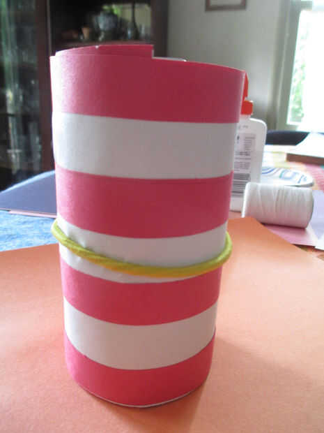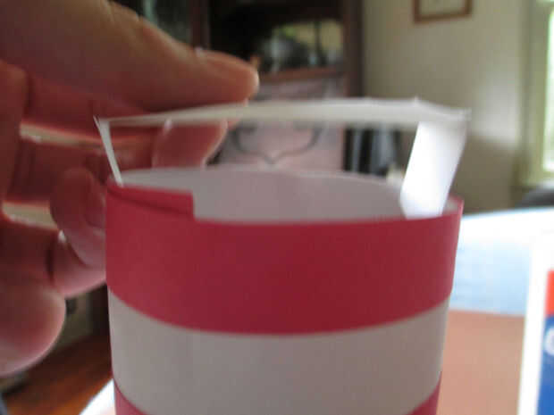 La porción de rayas blanca y roja del sombrero será capaz de llenar en el círculo cuando se hace. Usted puede hacer el agujero un poco más pequeño que la circunferencia de la lata para que la parte superior del sombrero puede ser colocada en el agujero y sujetar sin necesidad de pegamento.