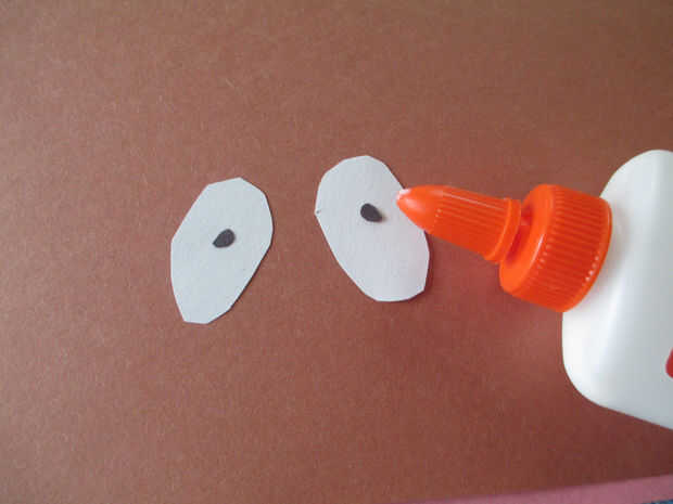 2. cortar dos círculos negros pequeños (pupilas) y pegarlos en el centro de los óvalos blancos