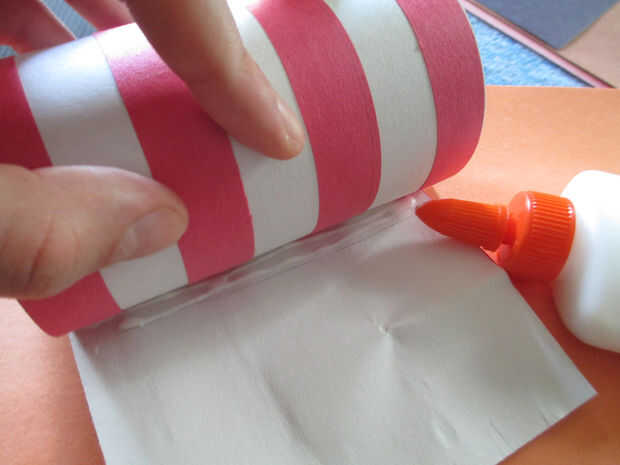4 envolver el papel con las rayas rojas pegados alrededor de la lata y cortar.