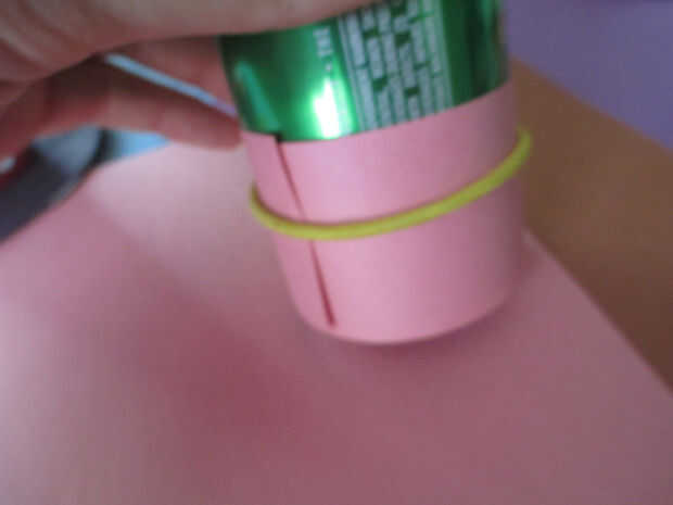 2. Envuelva a la tela alrededor de la lata y péguelo haciendo un cilindro corto