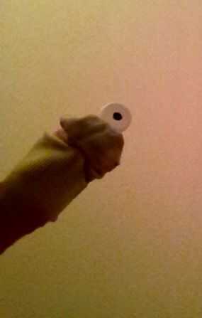 Usando cinta de doble cara, pega los ojos en el calcetín o la marioneta. Palillo de tantos ojos como quieras. La foto de arriba es un ejemplo de lo que debe parecer cuando termines. ¡ Sea creativo!