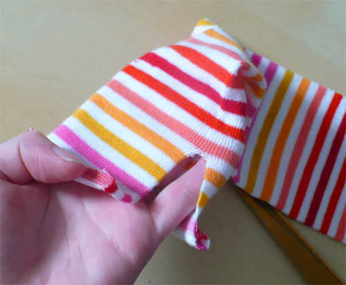 Cortar el extremo de su calcetín (en este caso tenía un calcetín de la rodilla así que cortar la parte de pie y sólo utiliza el extremo más largo). Luego, corte una hendidura en los lados para hacer la boca. Puede utilizar la boca de fieltro para trazar y alinear los bordes en el calcetín. Esto le dará un buen ajuste cuando comenzar a coser.