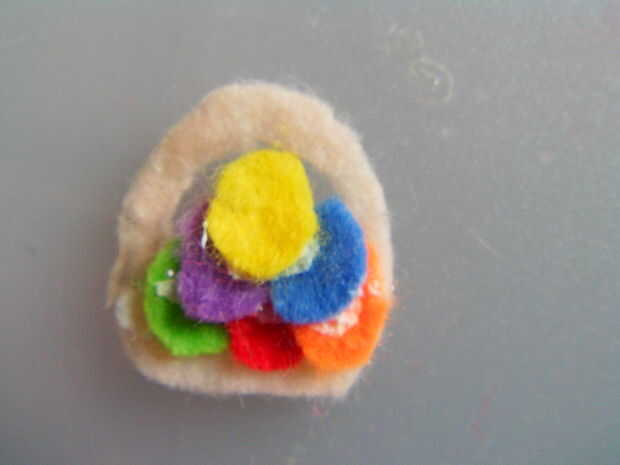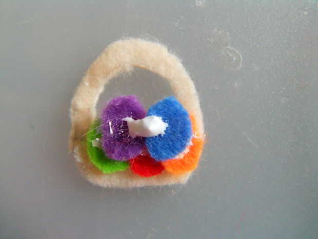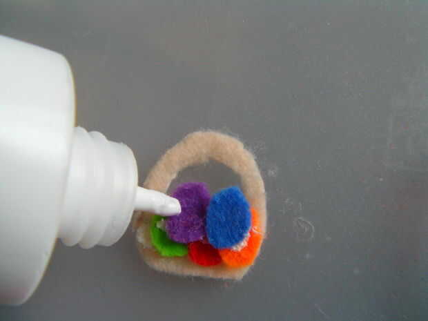 Primera toma su color de piel (o blanco o marrón) fieltro y dibuja una forma de cesta en él. Asegúrese de que el mango es bastante grueso por lo que no se romperá. Ahora recórtalo, incluyendo el centro. Luego necesitas cortar 6 colores diferentes de formas de huevos pequeños que caben en la cesta de los retazos de fieltro. Ahora voltea la cesta y pegar una línea a lo largo del borde de la cesta. Escoger tres huevos y colocarlas lado a lado en el borde. Puede Jazz encima y dibujar los patrones en los huevos si quiere. Ahora pegue otra línea por encima de los 3 huevos. Elegir 2 huevos y ponerlos en la cola, de lado a lado. Finalmente pegar a lo largo de los 2 huevos y agregar el 1 huevo final en la parte superior! Asegúrese de que los huevos se solapan. Luego voltee la cesta hacia atrás y verás que han hecho una cesta llena de huevos, un 'apoyo' para tu conejo! Espero que hayas disfrutado aprender a hacer este conejito de Pascua!