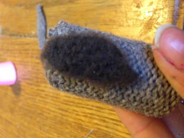 cortado de forma similar con tela tipo fieltro o franela.  Incluso corto piel de felpa no funcionaría debido al tamaño final.  Primero doblar borde dobladillo 1/4" y luego coser el lado derecho en forma el cuerpo del ratón.  Hacer incisiones muy pequ