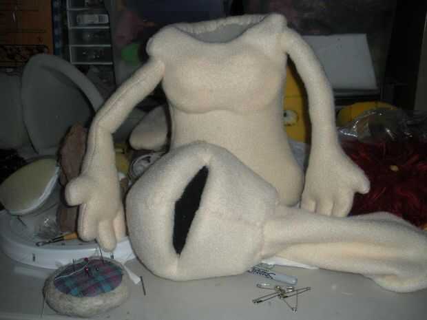 Crear la cabeza de la misma manera que creaste el cuerpo. Siga las instrucciones de su patrón. También cosí los bordes de la tela sobre la espuma para darle un borde limpio. Cortar y coser un trozo rectangular de tela y coser a la escucha de la marioneta para crear un cuello. En la base del cuello me creaba un círculo (hecho de la tubería del tanque de pescados) y acuñan una clavija pequeña clavija de madera entre los dos extremos de la tubería a unirse a ellos. Ahora cosido el cuello alrededor del tubo para crear un anillo de entrada.  Los brazos de la marioneta se hacen dibujando la forma del brazo en un pedazo de tela corte y lo costura. Una vez hecho esto usted rellenar con relleno de poli.