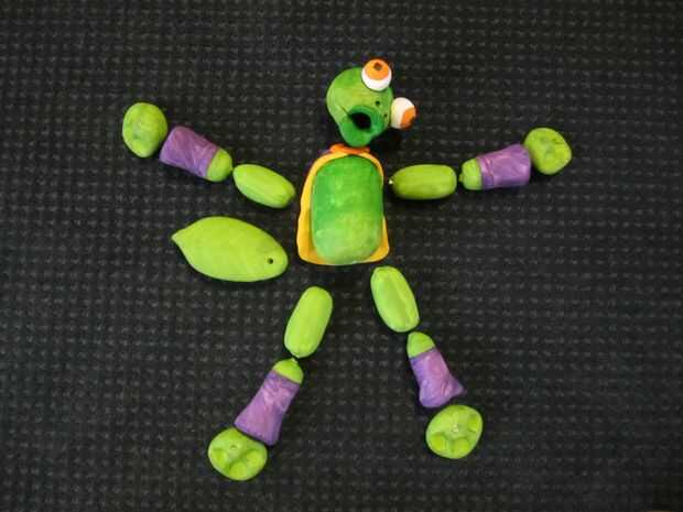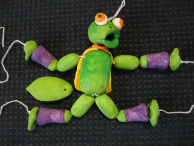 Pone todas las piezas de la marioneta a como se supone a. Este es un paso importante para asegurarse de que todas las piezas Haz conectadas correctamente. Es probable que se parecen un montón de piezas y desea que sus pies a lado derecho. Trazar la marioneta es la manera de ayudar a los más pequeños visualizar y poner a sus marionetas.