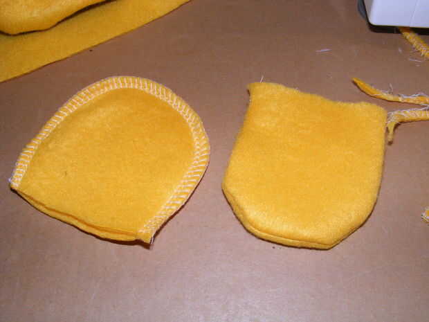 Coloque los oídos en el sándwich en el interior con las aberturas de la costura que se unirá. Coser o serge alrededor de los lados y parte superior de la marioneta para formar una figura en forma de bala.