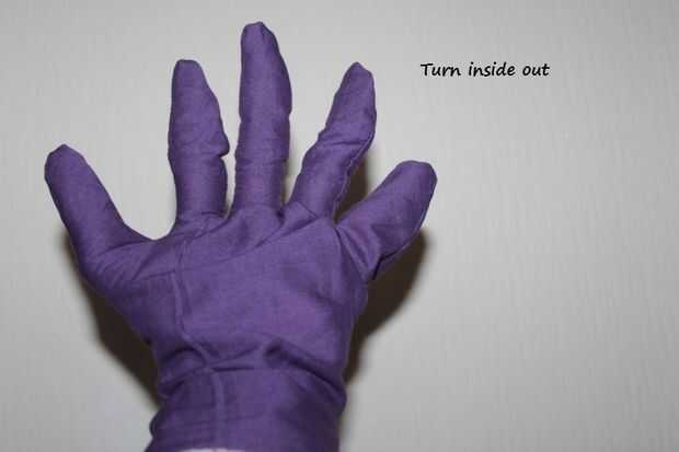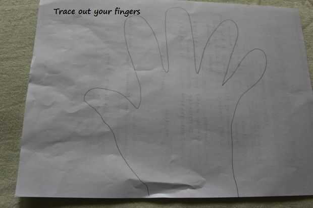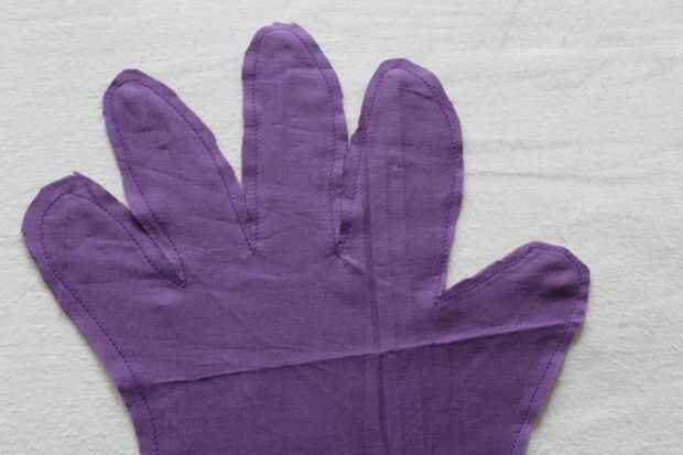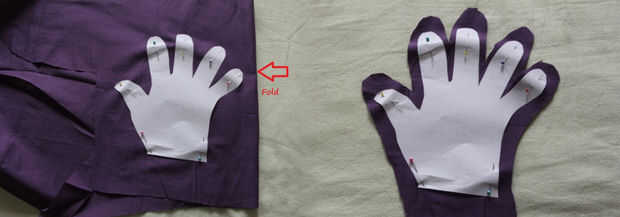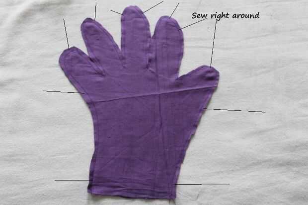 Trazar sus dedos sobre un papel blanco y recortar la plantilla. Doblar a la tela dos y coloque la plantilla sobre la tela, alfileres y cortar. Dejar un espacio extra de 1 pulgadas todo alrededor. Coser alrededor para hacer un guante. Gire el revés - ver última foto que lo lleva.