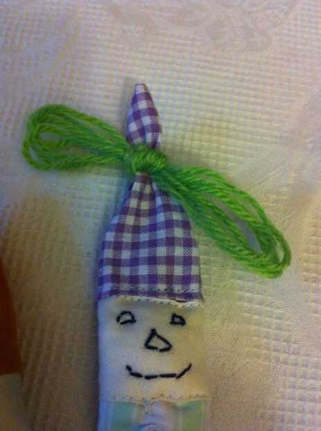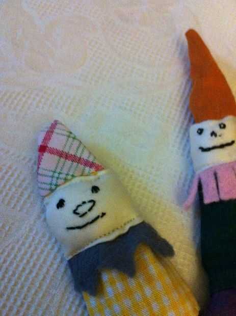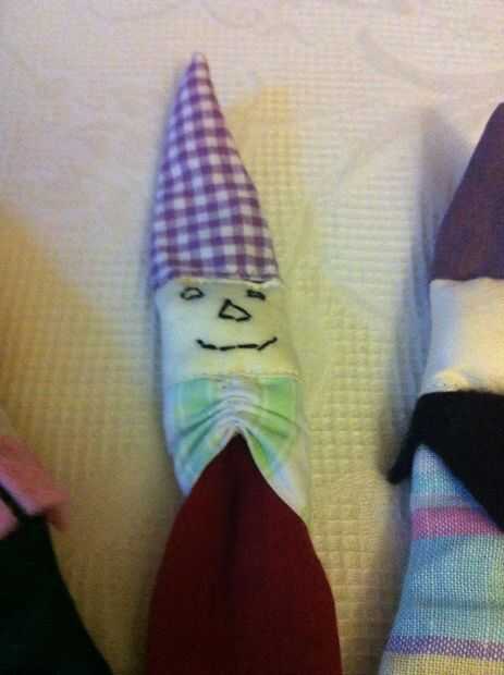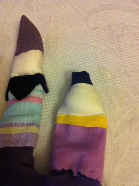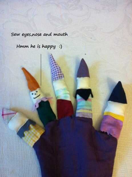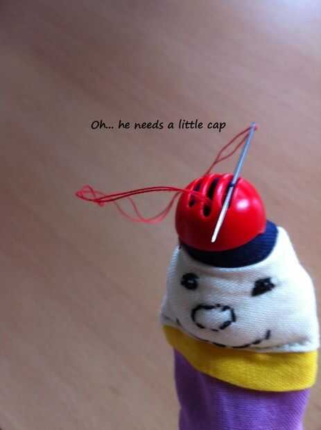 Ahora empezar a decorar agregando ojos, nariz y boca. Cosí un poco casquillo rojo a uno de los títeres. Es una pieza de juguete como una tapa. El gris, el rosa y el negro sentían piezas debajo del cuello, cortar y hacer como un collar. Un trocito de lana verde doblada y atada sobre el capó del motor se ve lindo. ¿Qué más necesitan? Supongo que antes de desplazarse hacia abajo
