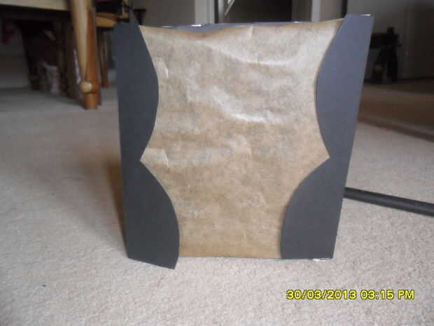 Consigue un trozo de papel de prueba de grasa o de papel (cualquier color como mejor) y hacer el mismo alto y ancho de la caja de cereal. Vara o cinta los dos extremos del papel a la parte delantera de la caja de cereal. Luego cortar dos formas que parecen cortinas de tarjeta negra. Adhieren a los bordes de la caja así (Asegúrese de que está sobre el papel grasa prueba!)