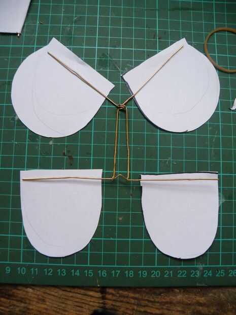 Luego doblé el papel por la mitad para cortar, haciendo dos espejados de pero idénticos conjuntos de alas.