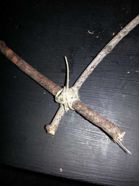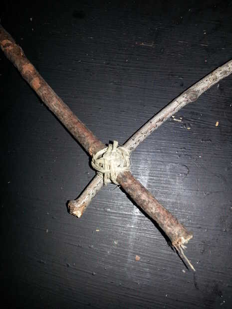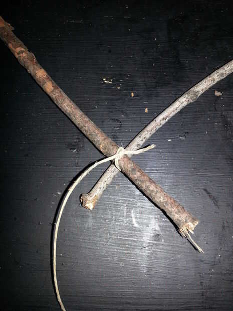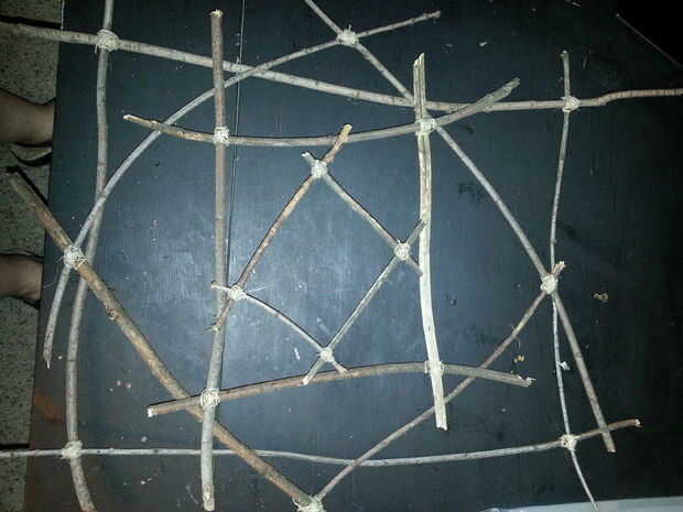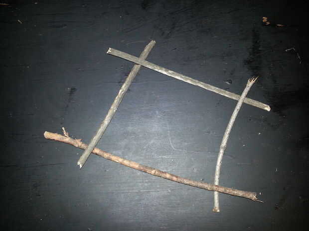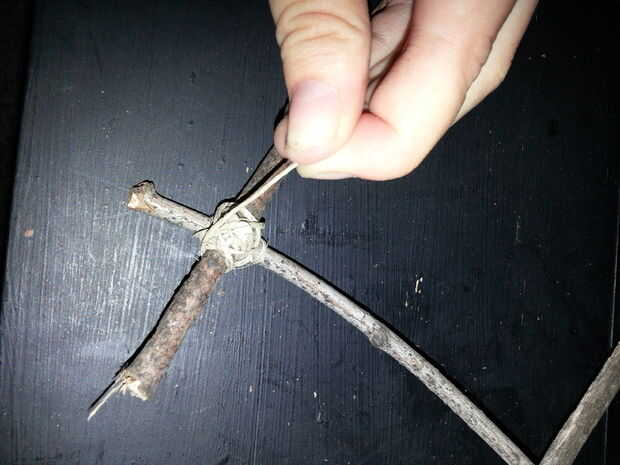 Escoge para comenzar con una articulación. He preferido empiece en el marco más grande y mi manera de marco más pequeño. Comenzar con atar la cuerda de cáñamo alrededor de dos palos y anudado con un nudo doble simple. Luego enrolle la cuerda de cáñamo alrededor de la articulación, hacer todo lo posible para que sea fuerte y estable como sea posible. Una vez que haya terminado de envolver toda la cuerda de cáñamo alrededor de la articulación, tomar el extremo de la cuerda y pegamento caliente en el lugar. Asegúrese de que se pega y sigue siendo firmemente envuelta. Una vez que el pegamento se haya enfriado, suéltelo.