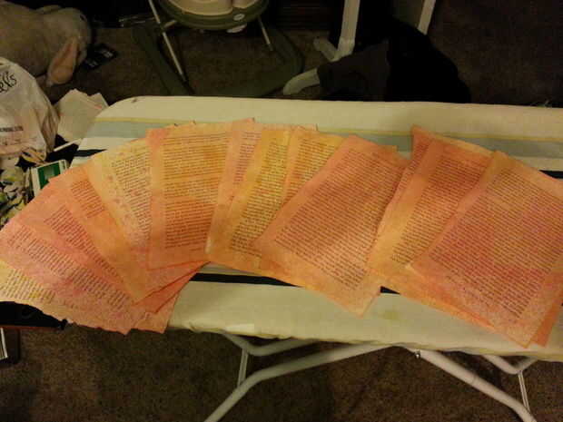 Una vez que su papel se extiende sobre la superficie de solicitadas, tomar tu botella de spray preparado con la mezcla de colorante y comenzar a rociar sobre el papel. Si quieres solo un encantador pequeño chorro, sólo rocía un poco. Si usted quiere completamente saturado y mocosa, rocíe fuertemente hasta que apenas pueda ver el color original del papel. Una vez que usted sienta que es rociar los documentos con suficiente cantidad de un colorante, cambiar a otra.
