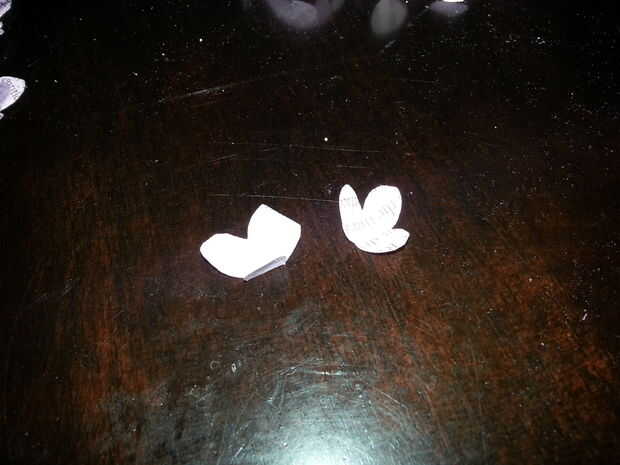 Corte, si se ven bien, ponerlos en una pila al lado y deseche el papel de que se cortan. Quiere recortar unos 250 a 300 de estas flores. Una vez está todo cortados, usted entonces quieren agarrar cada flor individual y plegar los pétalos.