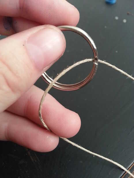 Estirar la cuerda en cerca de 14 pulgadas, toma el llavero y envuelva al gemelo alrededor de él en un lado unas 5 veces y los restantes 14 pulgadas al conjunto contrario la articulación ya que atado el cáñamo cordeles alrededor del estiramiento. Atar el extremo firmemente alrededor de la segunda articulación.