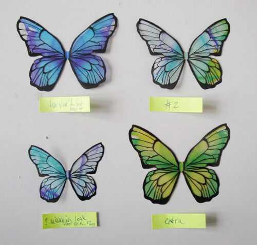 Ella trató de endurecer la tela utilizando colas de textil o algo, pero los resultados no fueron demasiado buenos. Ella copió el diseño del vestido de mariposa en hoja transparente y que era perfecto, ver fotos. La hoja transparente también se dobla bastante bien.