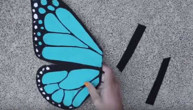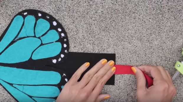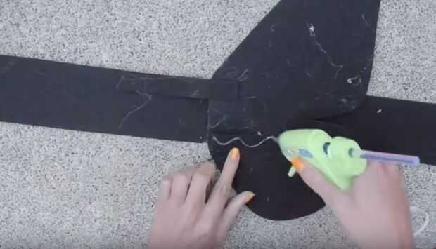 Corte dos piezas finas de fieltro atiesado que son aproximadamente 4" de largo. Pegue los extremos de estos en la parte posterior del ala. Luego pegue los otros extremos de estas piezas a la banda.