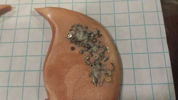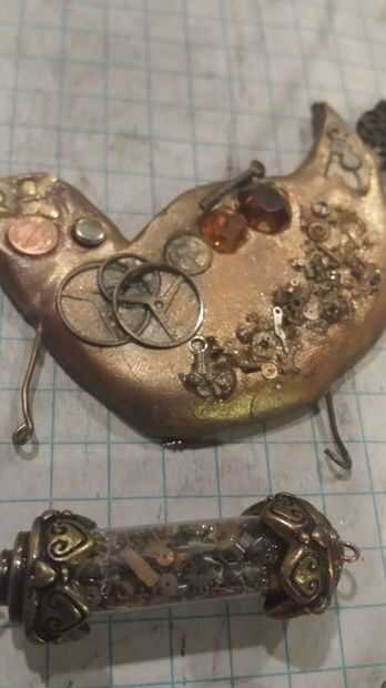 En mi pieza, he añadido tornillos y engranajes. También he añadido algunos cristales de Swarovski y algunos resultados mini (como la pequeña moneda y la mariposa)