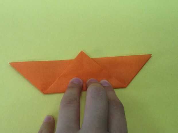 Doblar la parte superior un poco sobre el borde. Dé vuelta. Abrir la tapa superior y aplanar los triángulos.