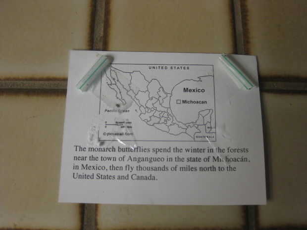 La cinta la paja en la parte posterior de la tarjeta de la mariposa en las esquinas superiores en ángulos de 45 grados, como se ve en la foto, manteniendo los extremos claro.