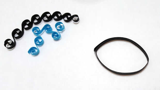 Encontrar dos objetos redondos pequeños de tamaños ligeramente diferentes. Los ejemplos están en la foto. 2 piezas de 12" negro quilling tiras para hacer una larga 24" tira del pegamento. Comenzar a envolver alrededor de su objeto redondo y pegar el extremo. Hacer 2 de ellos con el objeto más pequeño y 2 con el objeto más grande. Pinch contrario termina de modo que hace una especie de forma de 'ala'.