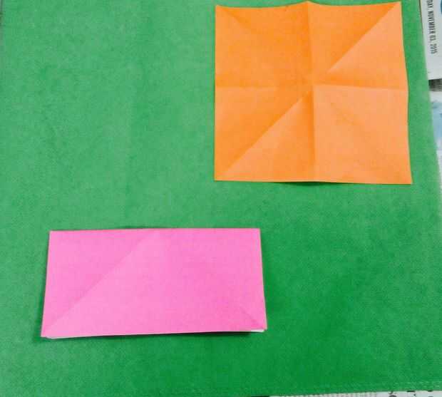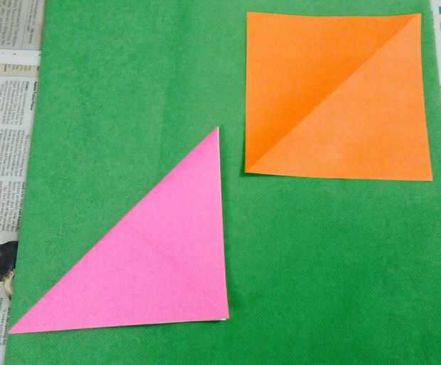 Arrastre 2 de las esquinas a sus esquinas opuestas. Luego, doble a la mitad de los lados. Mantenga que los doblada porque la hoja naranja muestra cómo los pliegues se ven, la figura debe ser hecho con el color de rosa uno.