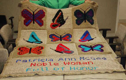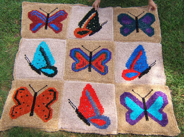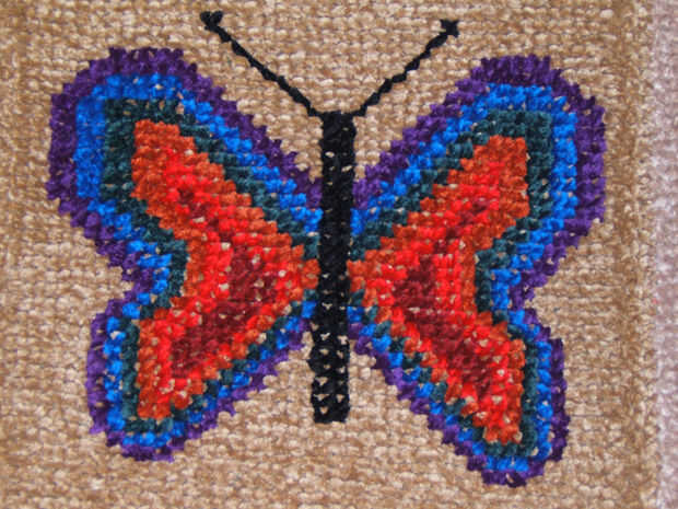 este es un diseño original hecho con Chenille grueso y rápido. Un amigo quería hacer un afgano de mariposa para ella, y mi favorito es el afgano puntada así que dibujé algunas mariposas, copian los diseños en papel milimetrado, a continuación, escribe en una hoja de cálculo electrónica. Creo que esto facilita el seguimiento de los puntos de sutura por lo que yo puedo marcar por completadas puntos de sutura en la hoja de cálculo impresa. Cruz cosió las mariposas en cuadrados con un gancho de afgano de tamaño K. Si tuviera que hacerlo otra vez, yo no usaría Chenille porque es tan pesado para que la puntada afgano y arroja al Cruz de costura.