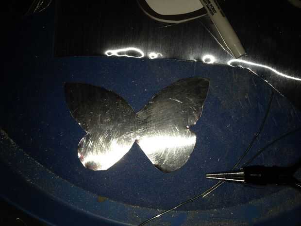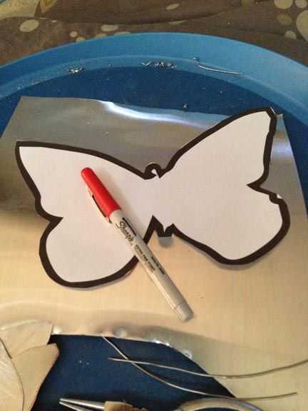 Al elegir el metal para trabajar con, centrarse en la acción más fina, como tapajuntas de aluminio de calibre delgado que es un metal más suave y más fácil cortar mi mano. Diseño de su plantilla y marca el contorno sobre el metal. Puede utilizar lápiz, crayón o tiza, pero tenga en cuenta que muchas marcas es necesario retirar antes de pintar. Elijo marcar el contorno con un rotulador rojo.