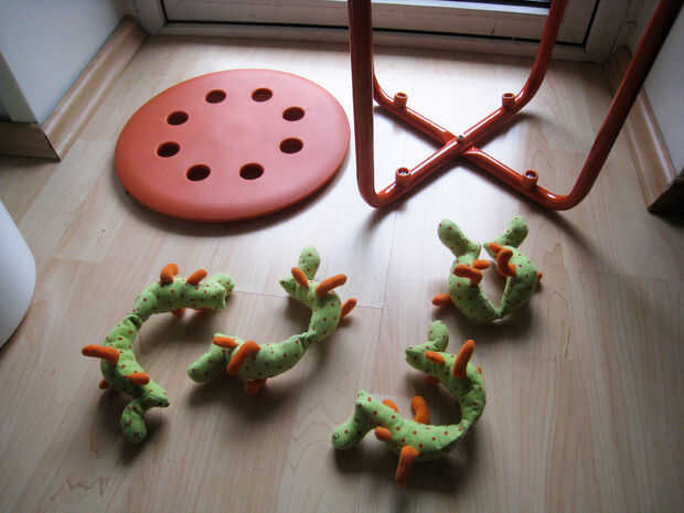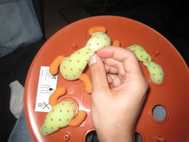 Empezó con los cocodrilos de coser juntos dos y dos en la cola. No tienes que poner en las heces como este, puede ser inteligente (a diferencia de mí) y coser primero y ponerlos en después.