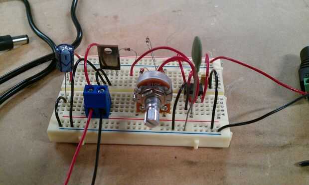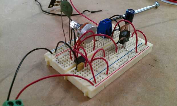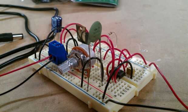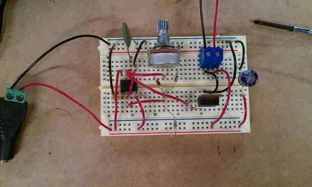 Con todas las piezas de mano, lo siguiente prototipo el circuito en un protoboard, para ver cómo funcionaría (o, más exactamente, si funcionaría). En el resistor del diagrama del circuito R1 (50K) se sustituye por el potenciómetro de 10K, pero que es realmente la única diferencia.