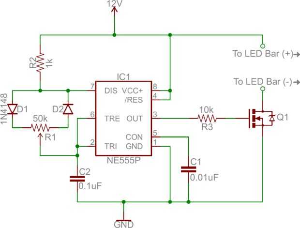 Usé un número de referencias diferentes para la construcción de este circuito. Instructables tiene una serie de referencias para los circuitos PWM, pero lamentablemente muchos de los que dependen de un microcontrolador para generar la onda PWM. Sparkfun tiene una breve discusión de atenuación LED usando un circuito basado en el 555, aquí: https://learn.sparkfun.com/tutorials/led-light-bar-hookup/all. El diagrama del circuito en esa página es lo que terminé usando para el diseño de mi circuito. Esta página (http://www.555-timer-circuits.com/pin-configuration.html) también hace un buen trabajo de hablar de cómo los trabajos del Temporizador 555 y explicando la configuración de pines. Hay un número de otras referencias disponibles en línea que hacen un muy buen trabajo de explicar la teoría del circuito, presentando ejemplos, etc..