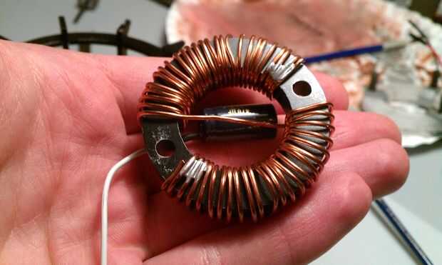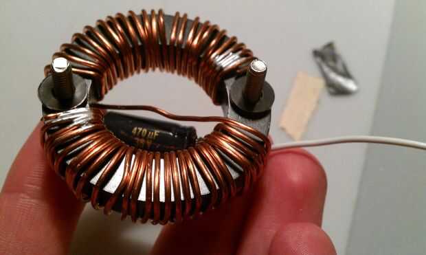 Una vez que la pintura esté seca, envuelto algún alambre de cobre desnudo calibre 18 alrededor de la mayoría de la base, dejando cerca de los agujeros para los pernos. 8-9 pies del alambre debe ser suficientes para envolver el núcleo como se muestra. Para facilitar la bobina un poco, rosca el cable a través del núcleo a la mitad del recorrido y luego envuelve el núcleo como dos mitades en lugar de todo de una sola vez. Tratar con 4 pies de alambre desgarbado es más fácil de 8 pies. En su mayor parte, este cable mantiene su forma cuando está doblado, pero he añadido un poco de pegamento en los extremos para mantenerlos en su lugar. Una vez el pegamento es seco, un poco de pintura plata hace estos look como una Unión de soldadura.