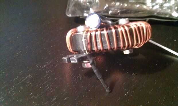 Os adjunto también un diodo en uno de los pernos, enfrente de plomo del condensador. Uno de los cables en el diodo se envuelve alrededor de la cabeza del perno, y el otro soldado a un cable jumper hembra corto. Esto terminará por asociar a un pin en el circuito de control. Esta pieza es opcional, y sólo utilizarla para llenar espacio y hacer que el inductor se vea más funcional.