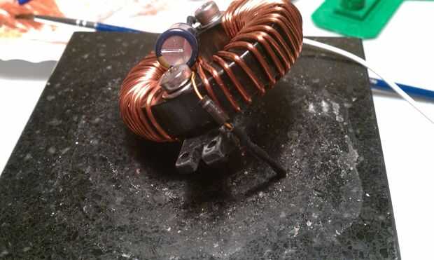 Sobre el circuito de control pero por debajo del anillo del reactor principal, tenía una brecha importante para llenar. Para llenar ese espacio, he creado un inductor de alambre-envuelve falso que se encuentra en el trozo de la traviesa. Esta pieza también tiene una ventaja que los hilos de rosca a través de la placa base en el reactor y se conecta a la clavija (no funciona).
