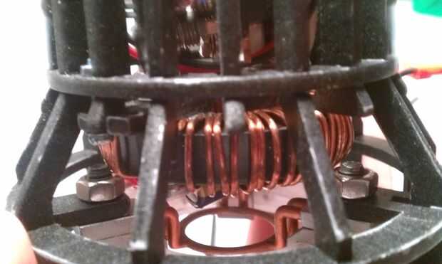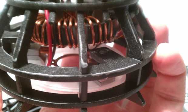 Después de que el anillo se introduce en la jaula, coloque el + y - de los LEDs a los pines correspondientes en el tablero. Si lo desea, puede probar los LEDs en este momento y asegúrese de que todo funciona. El siguiente paso será asegurar el anillo a la jaula, con las tuercas que coincidan con los pernos en los soportes. Porque yo soy un diseñador sádico, hay una muy pequeña cantidad de espacio entre el inductor y los pernos. Tanto es así, que realmente no pueden dejar las tuercas en los pernos. En su lugar, tendremos que deslizar los soportes en las tuercas y apriete lentamente (me siento extrañamente orgullosa de esta parte).