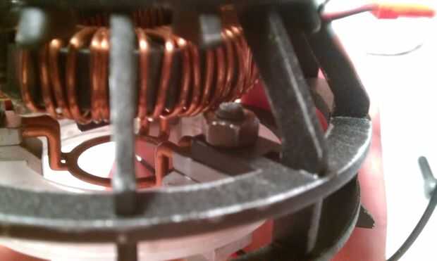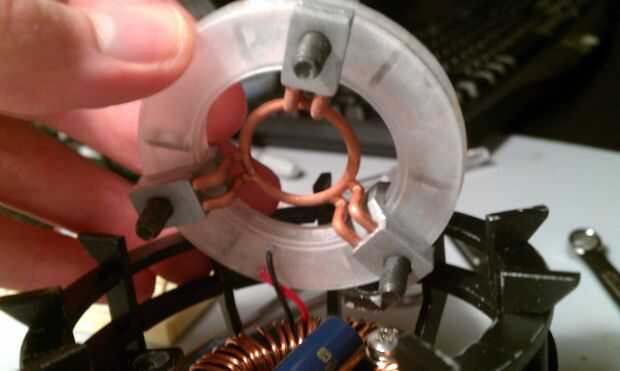 Ahora, montar esta pieza en la jaula. Esto debería encajar en las tres pestañas en el aro de la jaula de reactor medio. Debido a variaciones en cómo los soportes fueron impresos, cómo se unieron los pernos, cómo el reactor anillo caso fue montado, etc., estos podrían no encajar perfectamente. Esta pieza debe caer con sólo un poco de fuerza requerido. Si el ajuste es muy apretado, utilice una lima para ensanchar los orificios un poco hasta que se adapta a la pieza. Cuando el anillo, ten en cuenta de donde el + y - las líneas se terminan. Estas necesidad de fijar en un lugar específico en el circuito de control, en un paso anterior, así que asegúrese de que los conductores de línea en este lado de la Junta.
