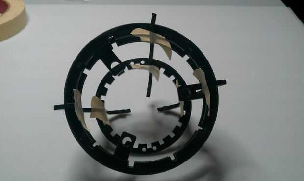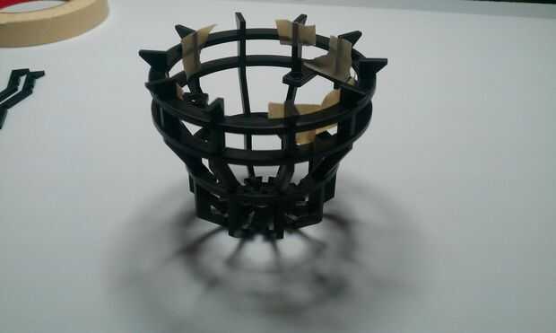 Ahora, la jaula del reactor debe comenzar a llevar a cabo su forma un poco mejor. Tomar los restantes 8 taller vertical soportes y ranura en los lugares apropiados. En lugar de cinta. Tenga en cuenta que se deben llenar todas las ranuras de los anillos grandes, pero sólo la mitad de ellos están llenos en el anillo más pequeño.