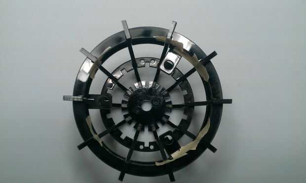 Ahora, con el anillo más pequeño, oriéntela para que la pieza soporte vertical cae a medio camino entre los dos conjuntos de orificios. Contados a partir de la ranura entre los agujeros, la pieza vertical debe malla con ranura 6. Esta cinta en lugar así. Nota: Cuando está montado, las ranuras en el anillo más pequeño se alternarán entre las piezas de soporte vertical alto y corto. Las ranuras entre los orificios de este anillo tendrá un soporte vertical corta, entonces otro tendrá un pedazo de apoyo alto, entonces un pedazo corto, etc..