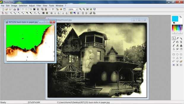 El último paso es quemar los bordes de la foto. Haga clic en grabar imagen, seleccione Copiar. Haga clic derecho sobre la imagen de la casa y seleccione Pegar. Haga clic derecho sobre la imagen pegada y seleccione Opciones de pegado. Marque la casilla de transparencia y establecer la tolerancia a 25. Haga clic en la imagen otra vez y seleccione transformación, gratis. Las opciones disponibles, ajustar tamaño, posición y ángulo. Haga clic en Aceptar cuando esté en la posición correcta. Seleccionar Sepia nuevamente para mezclar las dos imágenes. Ahora tenemos evidencia fotográfica de un famoso inquietantes!