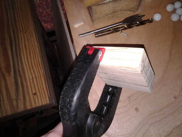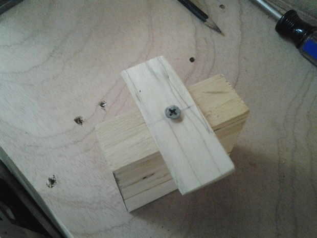 El primer paso es colocar la puerta al frente de su bloque. Tomar la astilla de madera y alinee con el borde de su bloque. Asegúrese de apretar hacia abajo para que no se mueva mientras el taladro. Encontrar el centro de la puerta (debe ser en la marca de 1 1/2") y márquelo. Ahora perfore a través de la puerta y en el bloque con una broca adecuada al tamaño del tornillo tiene.