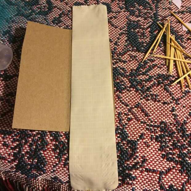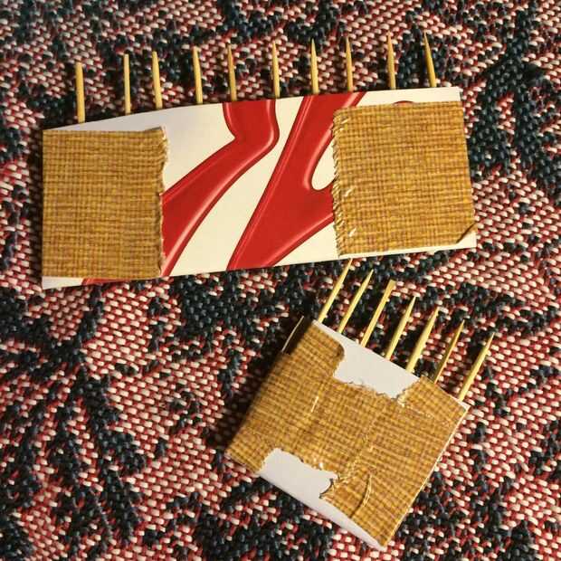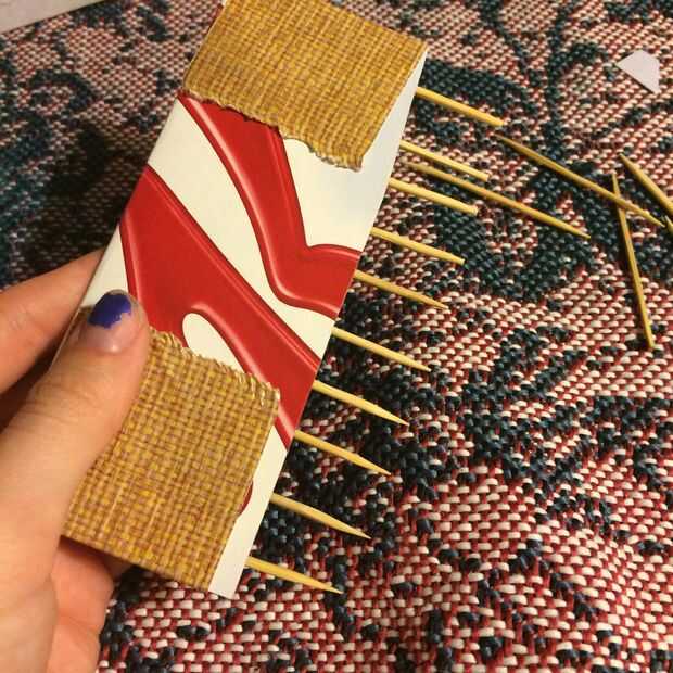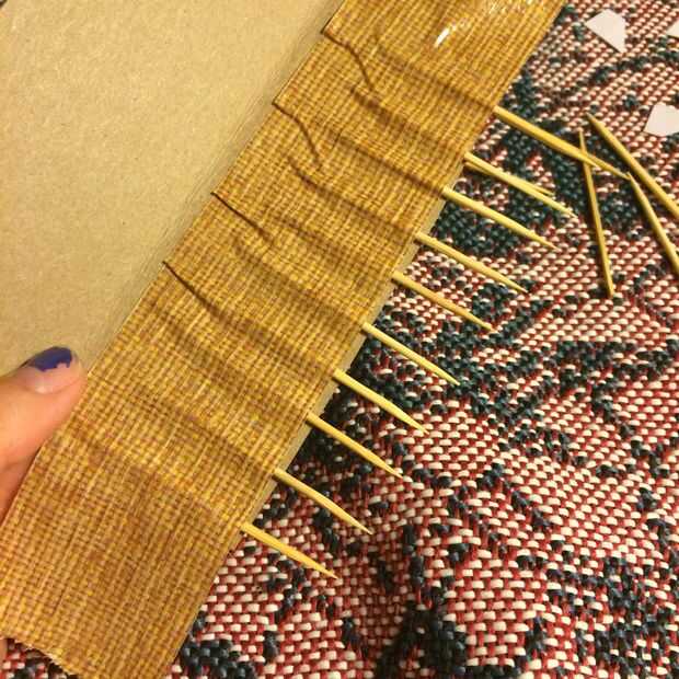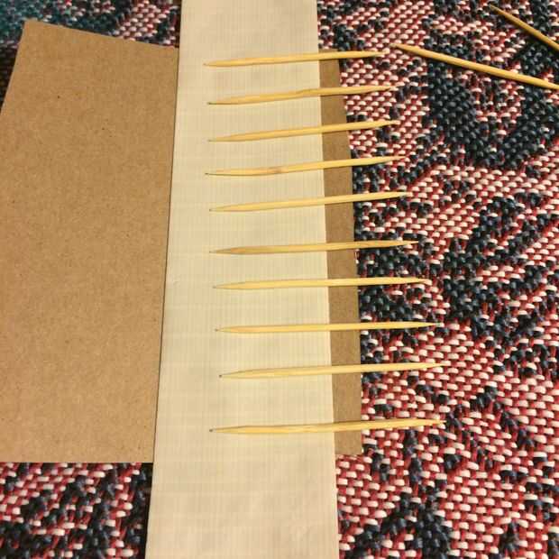 Use cinta para unir los palillos al pedazo de cartón (uniformemente espacio los escarbadientes y recubrirás sólo en la mitad de la pieza de cartón)